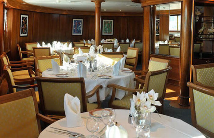 Voorzieningen aan boord Met een groot zonnedek, een panoramisch outdoor restaurant en een marina platform is alles erop gericht om volop buiten te kunnen genieten. Je hebt rechtstreeks toegang tot het water vanop het marina zwemplatform, waar ook watersporten aangeboden worden. Binnenin vind je een drietal lounges, waarvan de Emerald Lounge de grootste is en ook gebruikt wordt als piano bar. Het gastronomische hoofdrestaurant heet het Karukera Restaurant , met een verfijnde Franse en internationale keuken. Alle cruises zijn all inclusive , wat betekent dat je tijdens de maaltijden en in de bars onbeperkt kan genieten van een uitgebreide selectie dranken.